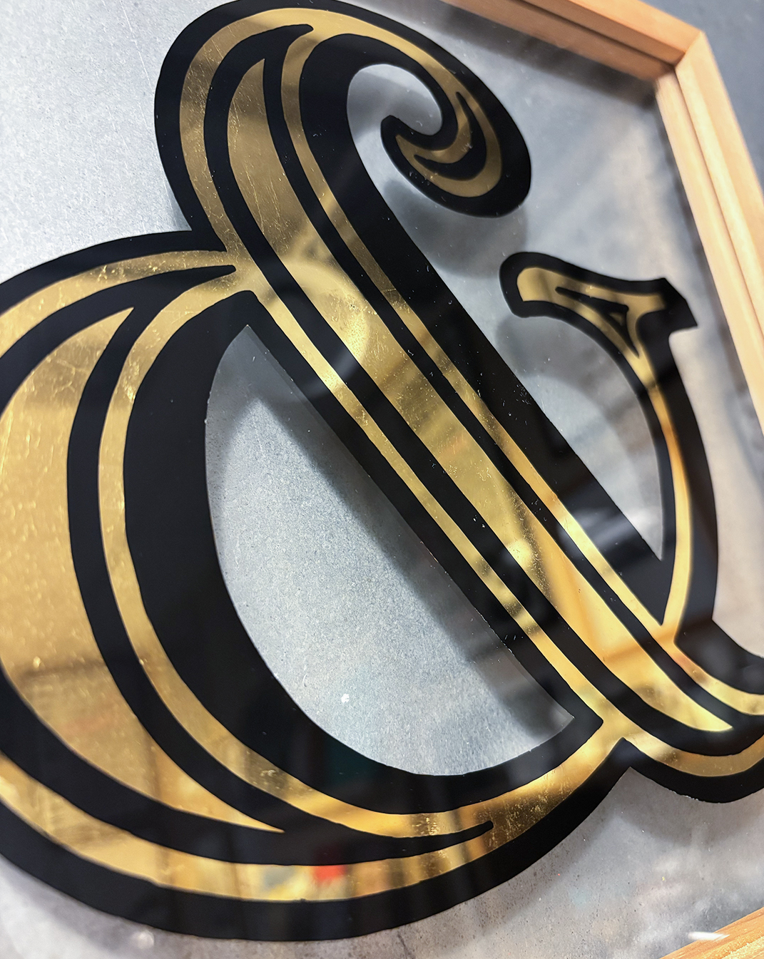 Handvergulde ampersand op glas.
